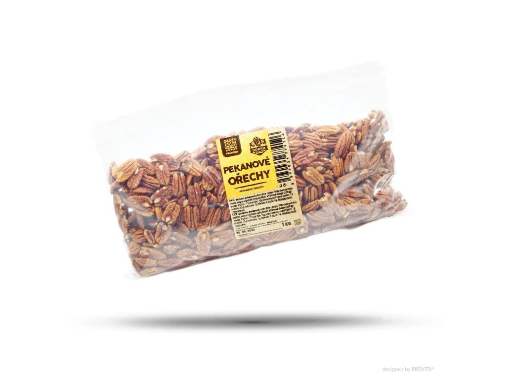 Nepražené a nesolené pekanové orechy. Pekanové orechy sú veľmi populárne v Spojených štátoch a sú súčasťou mnohých tradičných amerických receptov. Podobajú sa našim vlašským orechom, majú však sladšiu a jemnejšiu chuť. Sú veľmi chutné a výživné: sú bohaté na zdraviu prospešné tuky, bielkoviny, vitamíny (najmä B1, B6 a kyselina pantoténovú) a mnohé minerály (mangán, meď, horčík, zinok, fosfor). Orechy vo všeobecnosti patria medzi najzdravšie potraviny a konzumácia asi hrsti denne napomáha nielen k správne fungujúcemu telu a mysli, ale i dlhovekosti. Pekanové orechy si vychutnáte samotné, ako prísadu do müsli, koláčov, pesta či na ozdobu šalátov a iných jedál. Sú základom klasického amerického pekanového koláča s javorovým sirupom.