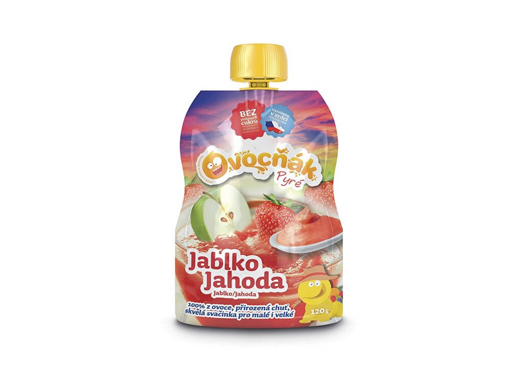 100% jablčno-jahodová ovocná dreň vyrobená v srdci Bielych Karpát zo starostlivo vyberaných plodov z certifikovaných sadov a od overených pestovateľov. Pyré je vynikajúce pre stravovanie malých detí, pretože je ľahko stráviteľné a bohaté na živiny – ovocie je skvelým zdrojom vitamínov, antioxidantov i vlákniny. Chutí však aj dospelým a vďaka šikovnému baleniu je výborným spoločníkom aj na výlety. Na jedno balenie drene bolo použitých 170g ovocia, ktoré bolo šetrne pasterizované pri teplote do 82C, aby sa v ňom zachovalo len to najlepšie. Pyré nie je nijako zahusťované a je bez konzervantov, pridaného cukru, škrobu, aróm a umelých prísad. Prirodzene vegánsky a bezlepkový produkt.